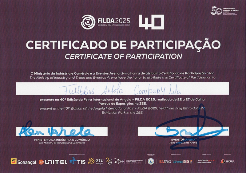 福盈安哥拉有限公司(Full Bliss Angola Company Lda)于2025年7月22日至27日在安哥拉羅安達(dá)–本戈經(jīng)濟(jì)特區(qū)參加第40屆羅安達(dá)國際展(FILDA)。